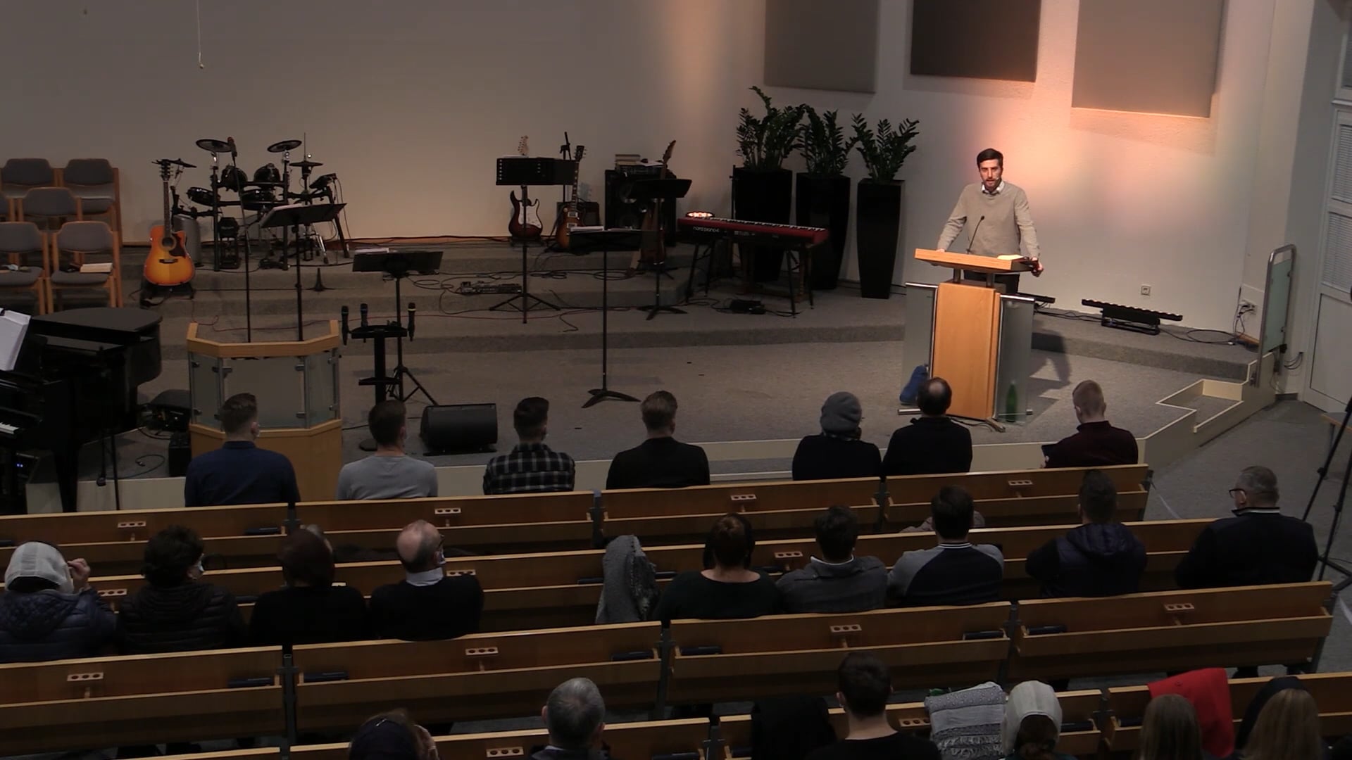 Wir haben zurzeit drei Gottesdienste – drei kürzere, identische Gottesdienste. Das heißt, die Musiker sind dreimal am Vormittag dran, die Lieder zu singen. Die Techniker müssen dreimal die Technik machen.