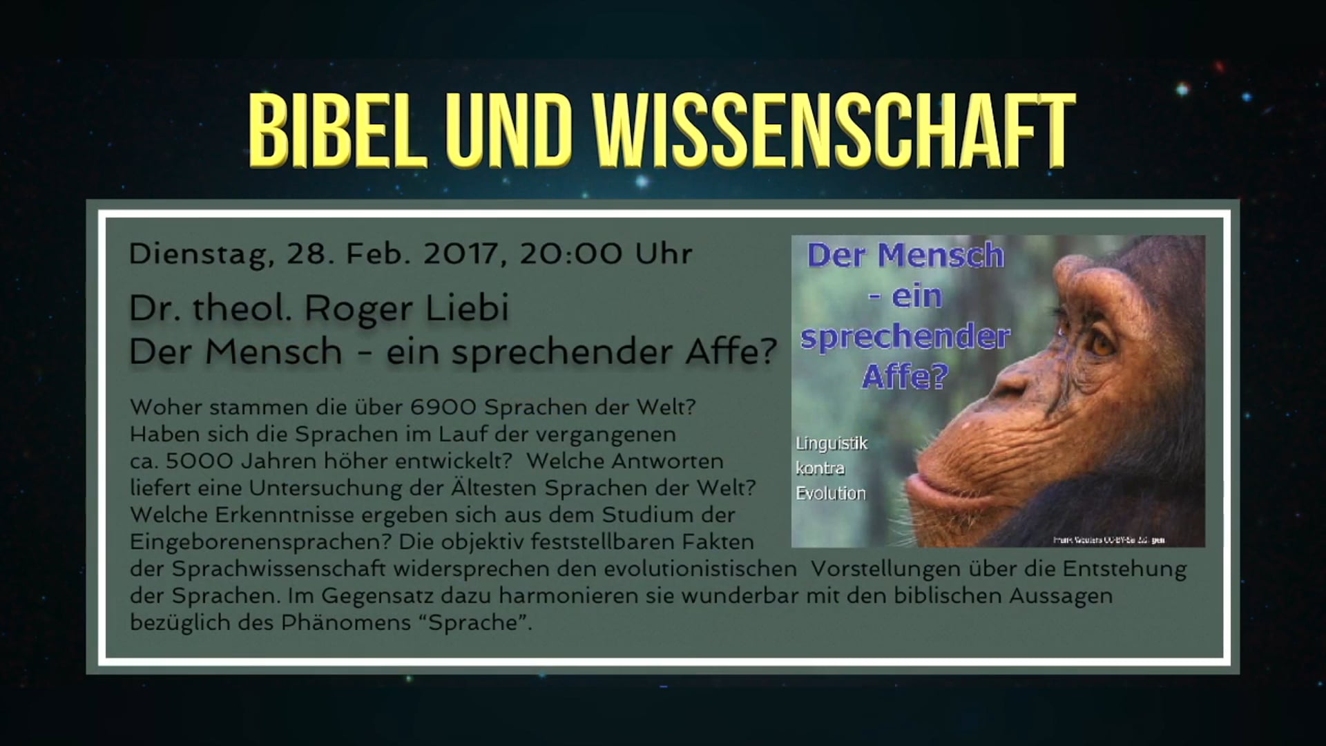 Guten Abend, meine Damen und Herren. Ich möchte Sie alle herzlich zu diesem interessanten Vortrag mit dem Titel „Der Mensch – ein sprechender Affe“ begrüßen.