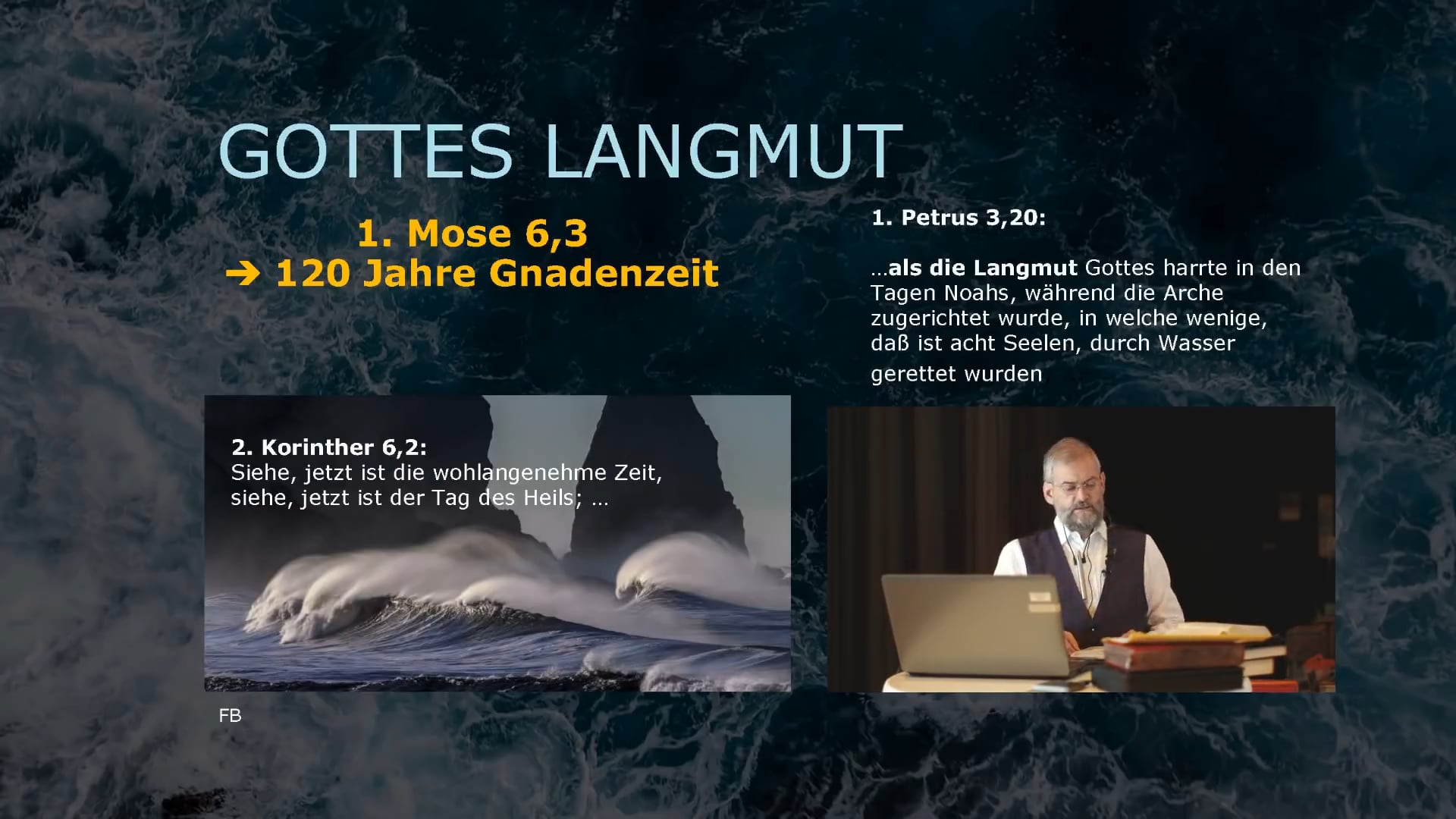Dazu möchte ich Psalm 46,1 zitieren: „Gott ist uns Zuflucht und Stärke, eine Hilfe reichlich gefunden in Drangsalen.“ Man muss den Kontext anschauen. Das passt wunderbar zu den Ereignissen der Sintflut, denn im nächsten Vers heißt es: „Darum werden wir uns nicht fürchten, wenn gleich gewandelt würde die Erde und wenn die Berge wankten im Herzen des Meeres, wenn seine Wasser tobten und schäumten, die Berge erbebten durch sein Ungestüm.“ Dann folgt ein musikalisches Zwischenspiel, bei dem man darüber nachdenken kann, was das bedeutet.