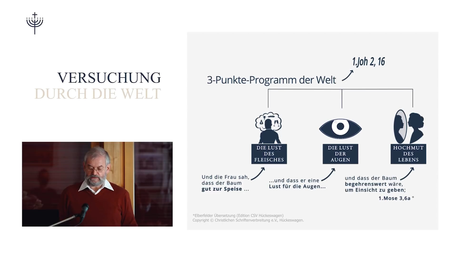 Das ist also auch Versuchung von außen, von der Welt. Und die Bibel zeigt uns dieses Dreipunkte-Programm: die Lust des Fleisches, die Lust der Augen und den Hochmut des Lebens.