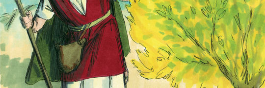 Mose erschrak, denn Gott war da, mitten in dem brennenden Dornbusch. Er wagte nicht mehr hinzuschauen und bedeckte mit seinem Gewand sein Gesicht. Deutlich hörte er Gottes Stimme.